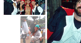 Ed's outfit was a snazzy Captain Morgan style ensemble, while most of his friends dressed in headscarfs, vests, striped shirts and earrings typical of the motliest pirate crews. The ladies wore wenches outfits, many with scandalously low plunging necklines. (Pirates don't generally mind a bit of scandal.)