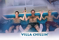 Each villa was a grand mini-hotel of its own, a sprawling one-story stone casa with orange tile roofs, huge living room, dining room and kitchen. The decor featured Latin-style scenic paintings and brass hanging ornaments, and colorful ceramic beaded lizards. Giant windows and glass doors offered a view across a massive stone veranda looking out over palm trees, white beach and blue Pacific. The 5--bedroom had it's own jacuzzi which got lots of use.